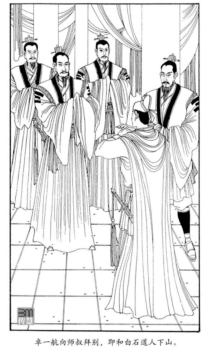 在四个师叔之中,卓一航平日与白石道人较为接近,得他同行,颇为欢喜。第二日卓一航拜别了三位师叔,又到师父的墓祭扫一番,这才和白石道人下山,一路晓行夜宿,走了十多天后,进入河南东部,白石道人忽道:“一航,我和你到嵩山一游如何?”卓一航一心想到北京,颇奇师叔有此雅兴,因道:“师叔何以要游嵩山?”白石道人笑道:“嵩山为五岳之一,大好名山岂能错过?”卓一航道:“待事完之后,回来时再游也还未迟。”白石道:“迟也不迟在这几天,而且我不单是去游玩,还想去访一个人。”卓一航道:“既然如此,那弟子自当奉陪。”心中暗怪师叔何不早说。