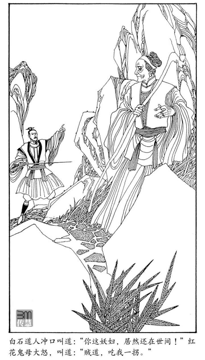 红花鬼母道:“小辈,你还不进招?”白石也道:“妖妇你还不进招?”红花鬼母把拐杖向石堆一拨,那些石头纷纷飞了起来,从白石道人身边飞过,却并不打中他,石弹纷飞,溅了白石道人一身尘土,白石大怒,青钢剑扬空一闪,蓦地一招“金针度线”,直取红花鬼母的咽喉,红花鬼母随手一抖,拐杖猛然压下,白石道人斜身滑步,一甩剑锋,踉踉跄跄向旁冲出几步,虎口发热,又惊又怒,刷刷回身两剑,使出了七十二手连环夺命剑的绝招,前发后至,快速之极!红花鬼母拐杖一举,将两招同时破去,道:“你能在我拐底逃生也算不错。”白石愤然进剑,霎眼之间,连进七招,红花鬼母一一破开,道:“唔,你这剑法我好似在哪见过,当今之世,有这样的剑法也算是一把好手了。”谈笑之间,连连反击,白石道人给迫得连连后退,跃过了好几个石堆,渐渐被红花鬼母困在石阵之中,白石道人知道难以逃脱,脚踏八卦方位,把剑使得风雨不透。红花鬼母攻了五十多招,把白石道人杀得汗水淋漓,但白石道人守得很稳,拼力支撑,竟然也无破绽。红花鬼母攻势忽缓,喝道:“紫阳道长是你何人?”白石道人这时羞愤交迸,不愿再提“武当五老”的名头,乘她攻势暂缓之际,突然两记绝招“鹰击长空”、“鱼翔浅底”,上下两剑,直取红花鬼母穴道要害。红花鬼母怒道:“你这小子不受抬举。”拐杖一横,把两记绝招都化了开去。左掌一伸,呼呼风响,砂石飞扬,威势惊人。白石道人抵挡她龙头拐杖,已自处在下风,她发掌助威,更是难敌,剑法渐渐散乱。卓一航一看不妙,冒着砂石,拔剑撞来,红花鬼母道:“哦,你也来了!”拐掌齐施,把两人都困在石阵之中。卓一航每挡一拐,身躯便震一下,知她功力太高,无法抵挡,只好连走巧招,助师叔防守。红花鬼母也好像对他特别留情,只把他的剑招挡开便算,并不使出杀手。