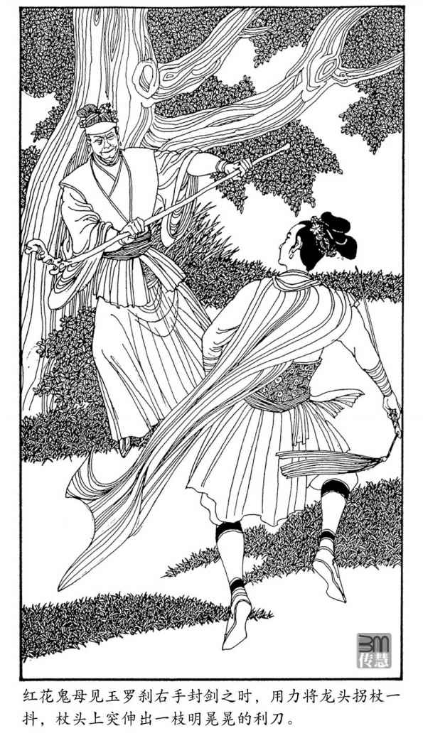 红花鬼母大怒,铁拐一震,把玉罗刹的宝剑荡开。铁飞龙叫道:“红花鬼母,你要不要脸?”红花鬼母一声不响,铁拐疾扫。玉罗刹冷笑道:“老妖妇,你还有什么伎俩?”运剑如风,虎跃鹰翔,飒飒连声,浑身上下,卷起精芒冷电。红花鬼母退了几步,突然一跃而上,用力将龙头拐杖一抖,玉罗刹左手捏着剑诀,右手横剑一封,只听得“当”的一声,红花鬼母的龙头拐杖一歪,杖头上突然伸出一枝明晃晃的利刃,凭空长了一尺。要知高手较量,分寸之间都要计算得十分准确,玉罗刹所占方位,本是拐杖不及之处,哪料敌人的拐杖头上忽然伸出一枝利刃,玉罗刹剑已封了出去,不及回防,红花鬼母身手何等迅疾,拐杖向前一送,利刃冷森森,指到了玉罗刹的心窝!