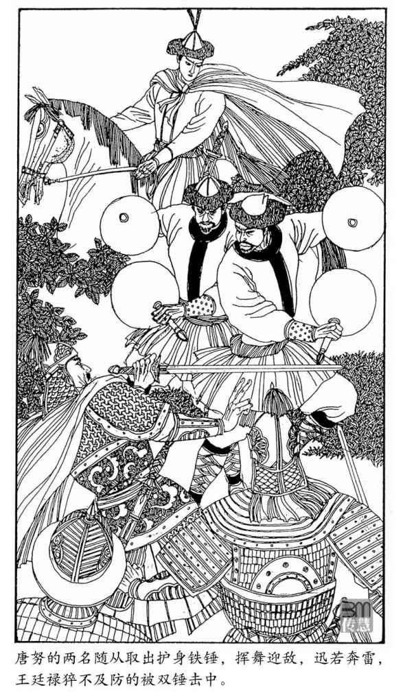 王廷禄武功较弱,手腕又给唐努刁住,猝不及防,南疆两个力士双锤齐下,顿时脑浆迸裂,死于非命。