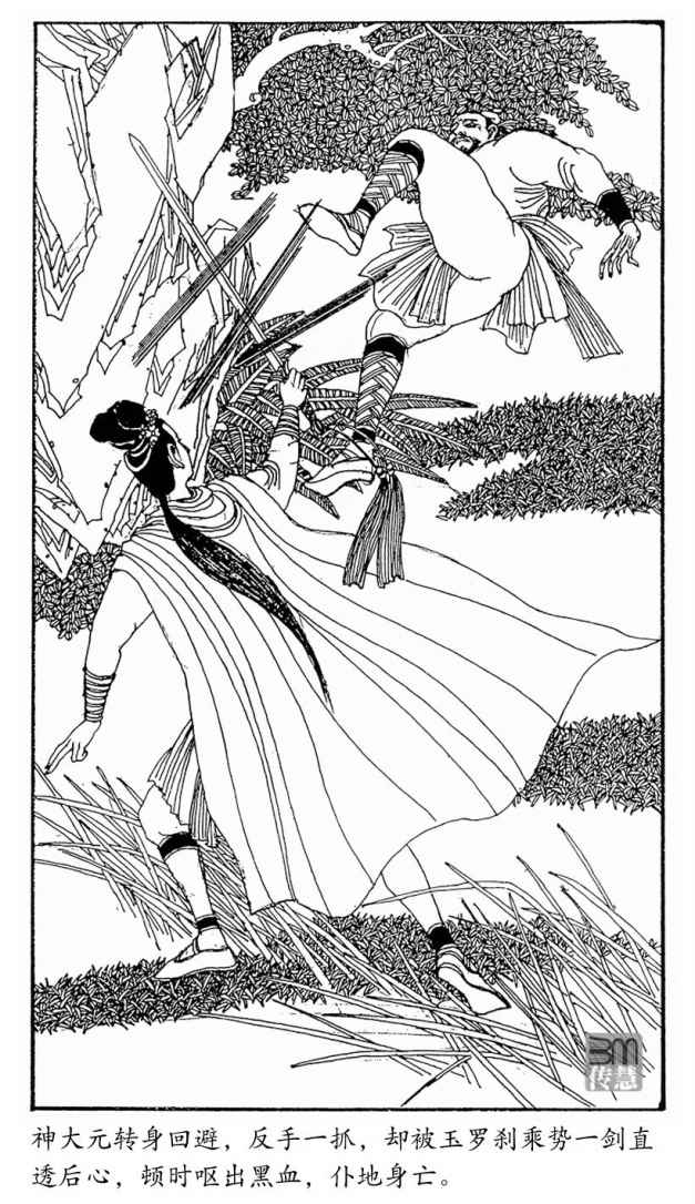 玉罗刹嘱咐了卓一航之后,一声长笑,脚尖一点,身子突然腾空飞了起来,从成章五等人的头顶飞越过去,在半空中挽了个剑花,向神大元猛刺,神大元吓得慌了,回身一避,反手一抓,神大元的野狐拳本来也是武林一绝,厉害非凡。可是玉罗刹自到塞外之后,潜心研习师父所留下的剑谱,剑法已到出神入化之境,神大元扑前一抓,被她乘势一剑,直透后心,神一元要待走时,又被她朝着后心一踢,顿时呕出黑血,仆地身亡!