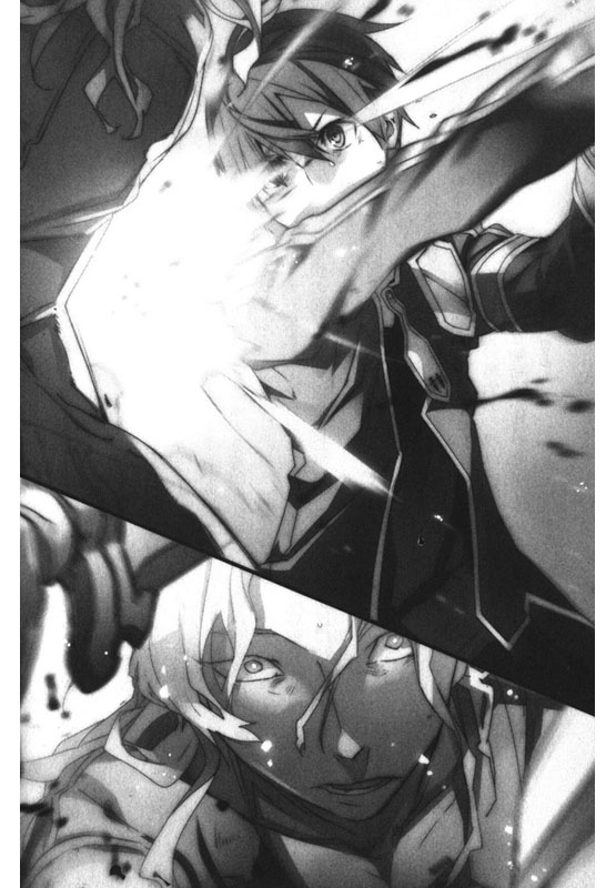 优吉欧的左眼流出了眼泪。这是对眼前那漂亮的剑技的感动,还有就是对于想要学习更多更多有关于剑的知识的悔恨的泪水。再次释放而出的桐人的《轮涡》,将莱依奥斯的剑切成了两截。