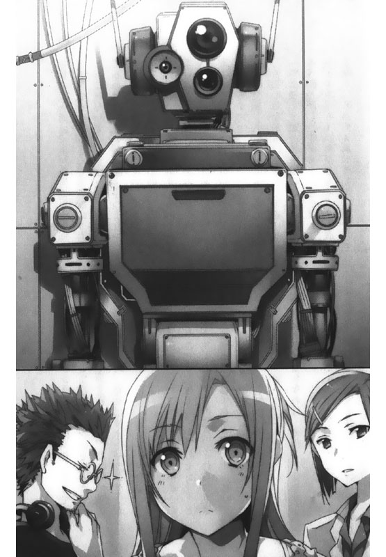 「YES,就是这个意思。如果辅助机械能够缩小到几分之一的话,框架就能变得更轻,Actuator也会减少许多,就能几乎实现人类的身体了……真是棒啊,不过这些还都只是设想哟。正如刚才所言,摆在开发部的仁右卫门,光看外形的话可是很像人类的哟。」