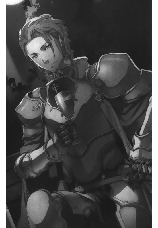 如波涛般的长发遮住了正面,无法看清面容,却能看到他纤细身体上穿着精心打磨过的白银铠甲,以及掛在左腰上的长剑。从他的双肩位置,垂下深色的披风。在我们视线的角度下,可以清楚地看到披风上的圆和十字构成的纹章。