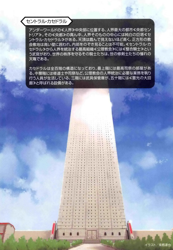 Under World内《人界》的中央,即是人界最大的都市《央都圣托利亚》。而位于央都中心——也是整个人界的中心的,就是纯白色的巨塔《中央大教堂》。教堂顶端高耸如云,正方形的教会用地被高墙环绕,完全无法窥视内部。《中央大教堂》内有统治人界的最高组织《公理教会》和名为《集成骑士》的武官,成为守护世界秩序的骑士,乃是世上所有修剑士们憧憬的天职。