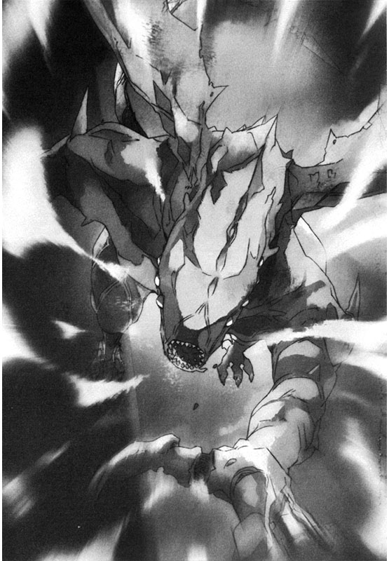咻!像鞭子一般飞拍过来的是尖端锋利如匕首的尾巴。对于这完全出乎意料的状况,我边哀鸣著边把头扭开。前端锐利的尾巴略微擦过我的左脸,总算是避免了被直击的情况。