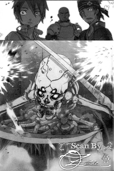我奋不顾身地飞奔而出。像在空中飞舞般瞬间缩短于敌人之间的距离,朝发出轰然巨响往下挥落的骨头镰刀下方冲了进去,接着交叉左右双剑挡下镰刀的攻击。