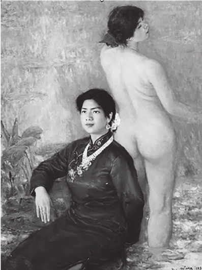 在油画中,正面的女人身穿着传统湘绣宝蓝色旗袍,静坐在椅子上,面部表情端庄,凝视着前方,出淤泥而不染的荷花开在画面前方。背面的女人犹如一尊希腊雕塑,感性沉醉地回头,身体是裸着的,头结是火红的,与身着旗袍的女人的素白色头结形成鲜明的对比。她站立在睡莲湖中……